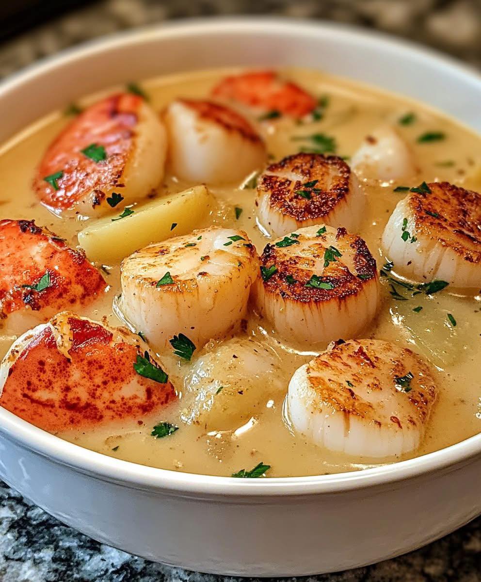 Warm, creamy, and brimming with the flavors of the sea, this Lobster & Seared Scallop Chowder is the ultimate coastal comfort food. Tender seared scallops and succulent lobster chunks are enveloped in a rich, buttery chowder with potatoes and aromatics, making every spoonful a luxurious treat. Perfect for chilly nights or when you’re craving gourmet seafood at home, this chowder delivers restaurant-quality flavors with cozy, comforting vibes.